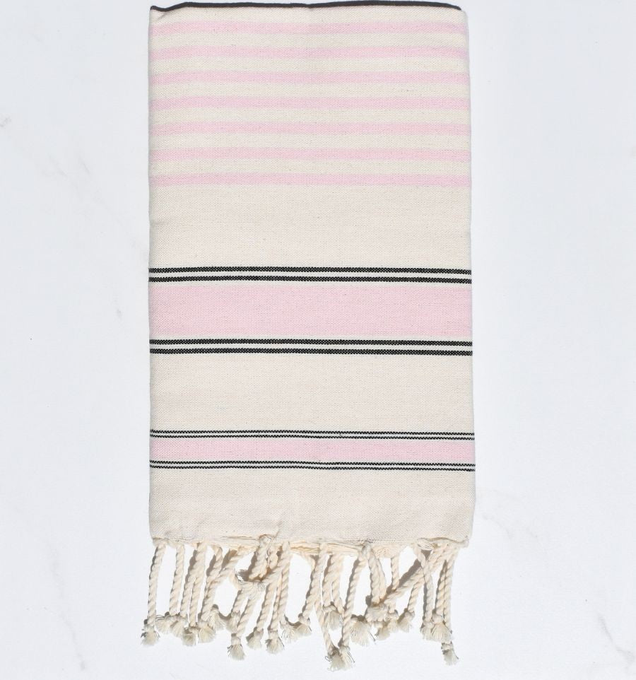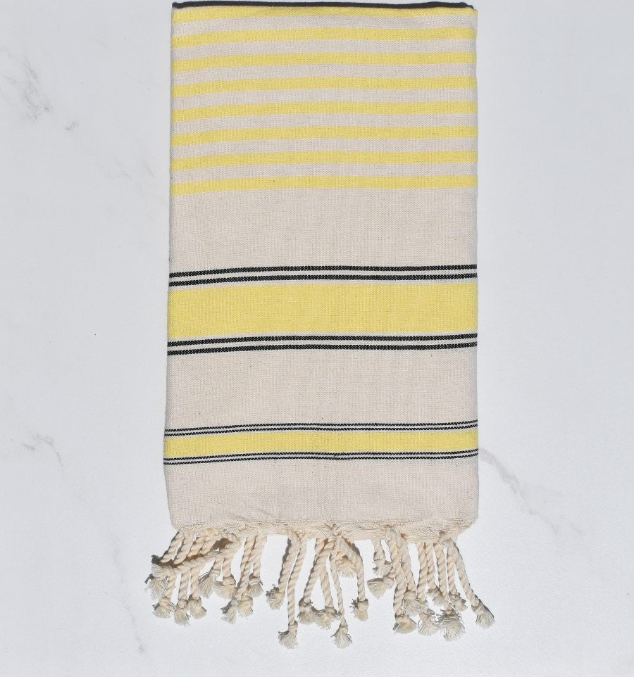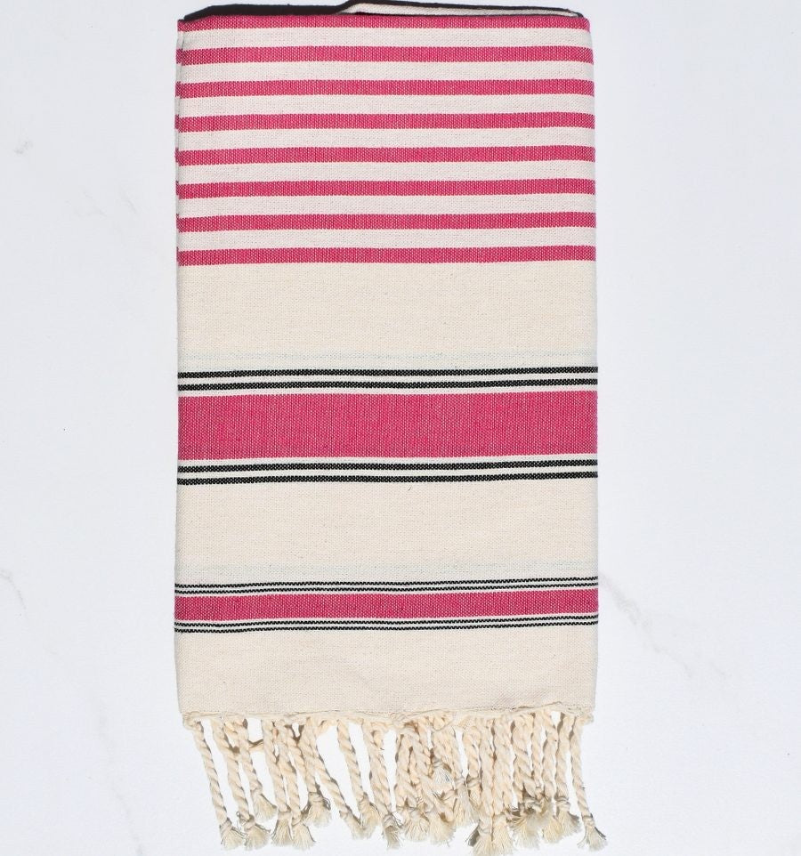 Ces foutas en tissage à plat avec bandes blanches et franges tressées sont les plus vendues et les plus connues traditionnellement. Elles sont élaborées de façon artisanale et finies à la main.
