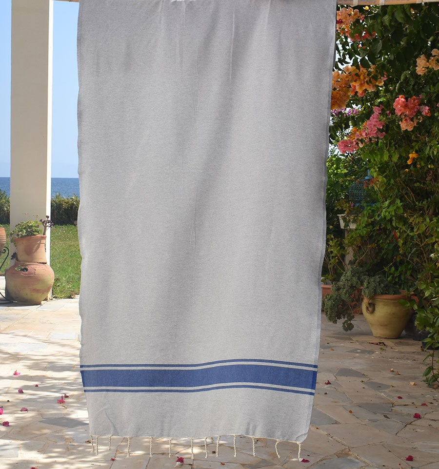 Bringen Sie einen Hauch von Stil in Ihren Alltag mit diesem eleganten grauen Strandtuch mit blauen Streifen, sorgfältig aus recycelter Baumwolle gefertigt.