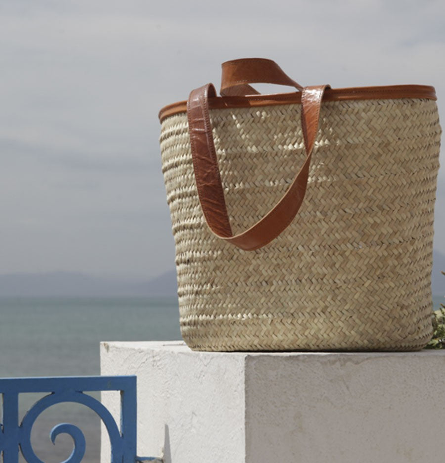 Questo Cesto grande con bordi e manici in pelle di grandi dimensioni, Cesto in palma naturale è l'ideale per la spesa al mercato, per una passeggiata, per un pic-nic, in piscina o al mare.